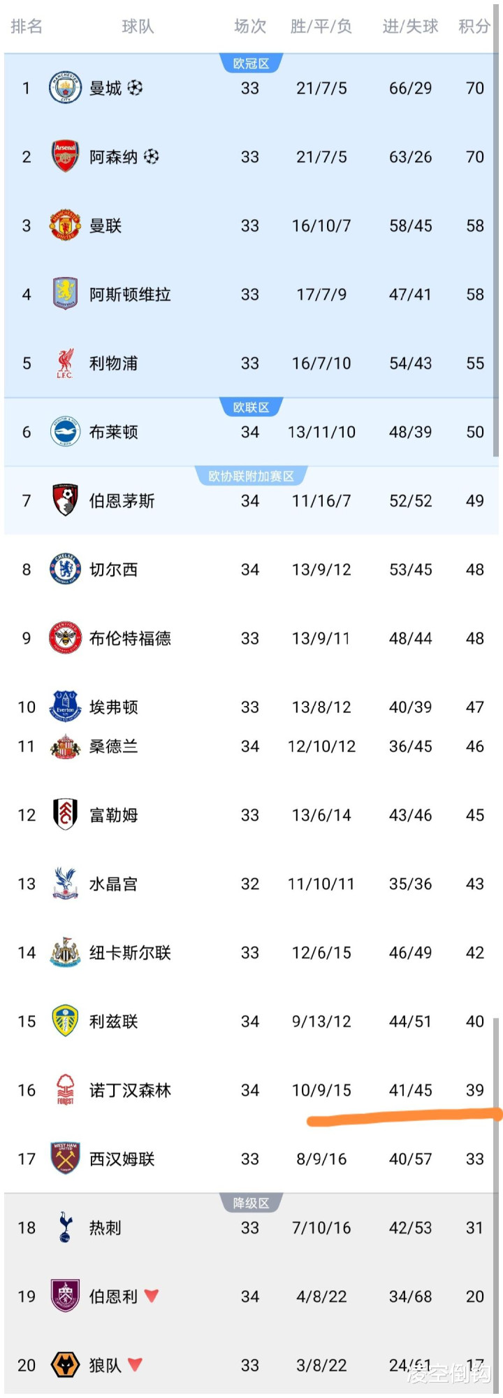 赛后英超积分榜更新:可以看到诺丁汉森林积分上涨到了39分,领先降级区8分,保级希望更大了。